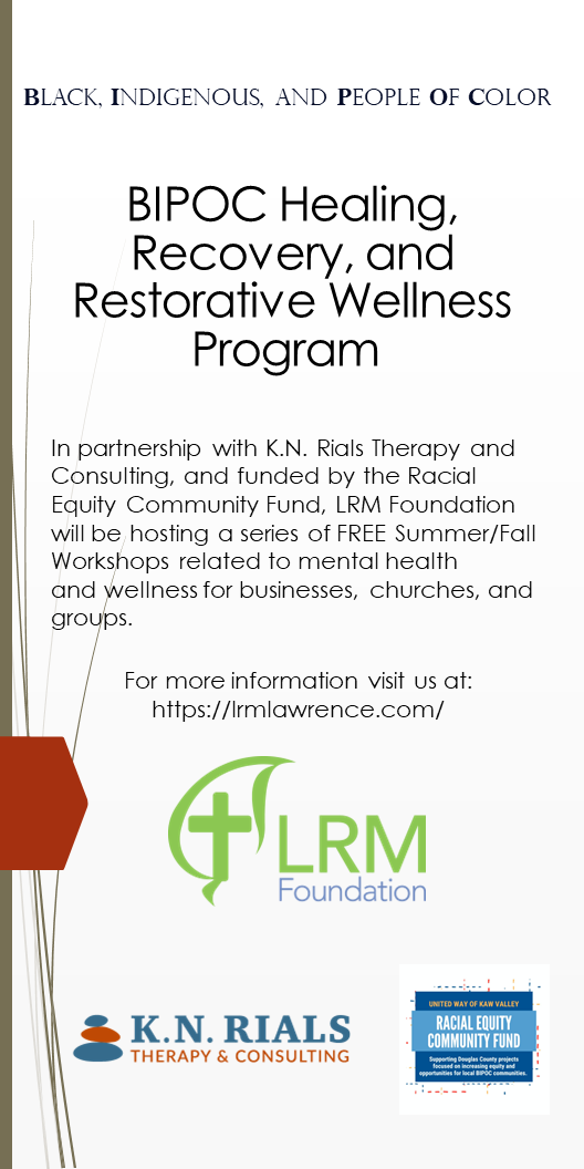 In partnership with K.N. Rials Therapy and Consulting, LRM Foundation is hosting free workshops in the Summer/Fall of 2023 related to mental health and wellness for businesses, churches and groups.  The workshops are focused on healing, recovery, and restorative wellness for Black, Indigenous, and People of Color.