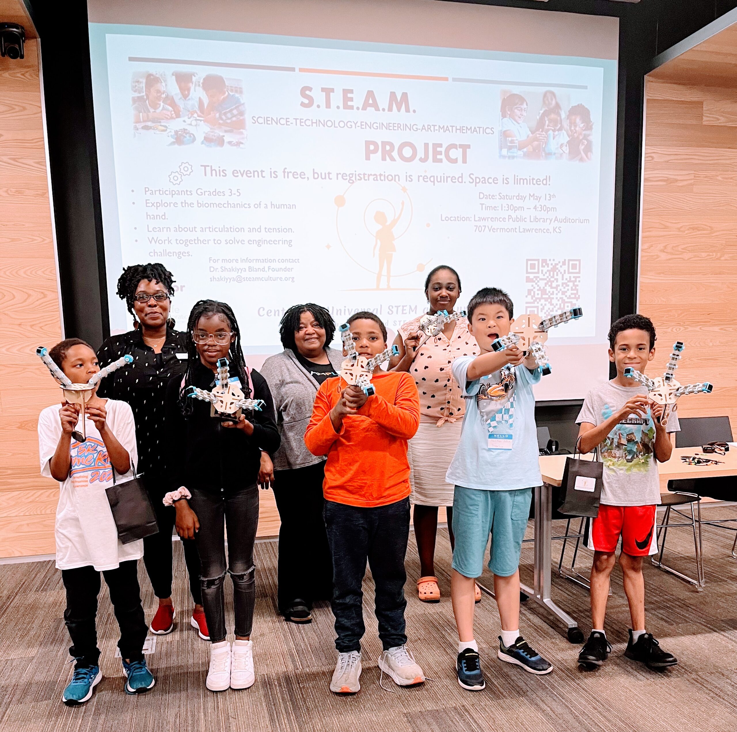 Dr. Shakiyya Bland founded this culture based STEAM learning program. Dr. Shakiyya Bland and Dr. Julitha Rials hosted a workshop at the Lawrence Public Library where students (grades 3 through 5) learned about the biomechanics of a human hand. The workshop explored more than just the nuts and bolts of the machinery. A cultural context was applied. Please watch our video to learn more.